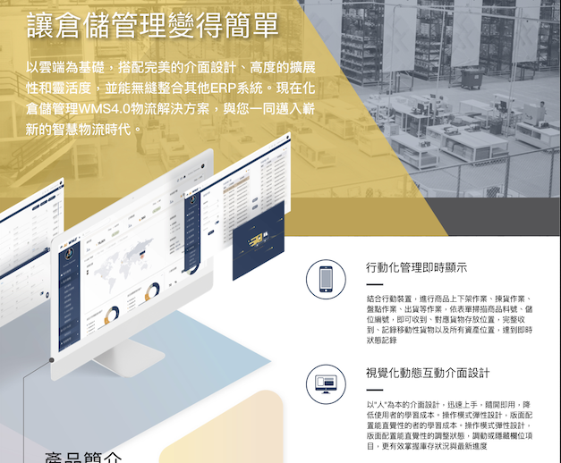【關於WMS】 WMS倉庫管理系統(或稱倉儲管理系統)由台灣使丹達資訊(Standard)獨立研發,軟體凝聚了行業專家們先進的設計理念以及在倉儲物流的服務經驗。為中小企業提供一體化的解決方案,帶給您以及您的客戶更好的用戶體驗與服務,構建現代化的智慧倉儲物流管理。